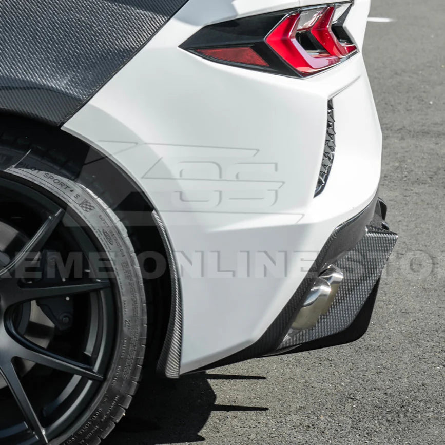 Fits all 2020–Present Corvette Z51, Stingray, and E-Ray models (excludes C8 Z06). Features EOS Performance styling, crafted from dry prepreg carbon fiber. Includes rear bumper diffuser with quad exhaust exit.
